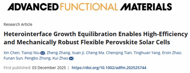 针对在低温工艺和柔性基底条件下,实现高质量钙钛矿薄膜的“本征增韧”与高效电荷输运的核心问题,我院赵奎教授团队提出了配体辅助的异质界面生长平衡策略,通过引入极性可调的双铵芳香配体对低温柔性制备的钙钛矿结晶动力学进行精准调控。该策略能够有效加速溶剂挥发,并在固–液界面与气–液界面实现协同调控,显著缩短成核时间、延长晶粒生长窗口,从而获得兼具高结晶质量、高机械韧性与强界面粘附力的柔性钙钛矿薄膜。在此基础上,研究团队制备的柔性钙钛矿器件实现了25.76%的光电转换效率,并在4 mm弯曲半径下经受30000次弯折后仍保持超过90%的初始效率,创下≥25.5%效率区间柔性钙钛矿器件的最佳弯折稳定性纪录。此外,团队首次将ISOS-LM-1标准引入光–机械协同老化评估体系,系统验证了器件在光照—弯折耦合条件下的长期运行稳定性。该异质界面生长平衡策略为构建高效率、高机械耐久性的柔性光伏器件提供了新的材料设计理念和工艺调控路径。相关研究以 “Heterointerface Growth Equilibration Enables High-Efficiency and Mechanically Robust Flexible Perovskite Solar Cells” 为题,近日发表于国际材料学知名期刊《Advanced Functional Materials》上.论文第一作者分为我院2024级博士研究生陈鑫,我院牛天启博士和赵奎教授为共同通讯作者(文章链接:https://doi.org/10.1002/adfm.202525744)。