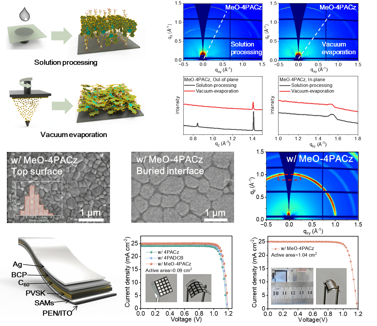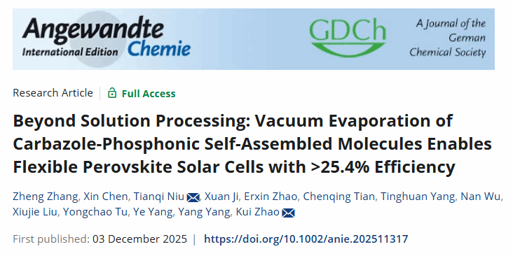 对于反式钙钛矿电池,传统溶液法制备的自组装分子(SAM)空穴传输层在柔性衬底上易出现覆盖不均与化学锚定不足的问题,导致界面缺陷增多以及电荷传输受阻,严重限制了柔性器件的效率与稳定性。针对这一关键挑战,我院钙钛矿材料与器件团队创新性地将真空蒸镀技术应用于SAM薄膜沉积,成功制备出高质量的SAM界面层,并系统研究了不同分子构型对柔性界面物性的影响规律。研究发现,干法制备的SAM薄膜具有更高的表面能和更强的化学锚定能力,能够在柔性沉沉地上形成致密、均匀且稳定的覆盖层,有效降低界面接触缺陷,同时确保上层钙钛矿薄膜的高质量沉积,有效提升界面电荷传输效率。基于此,团队制备的小面积柔性钙钛矿太阳能电池实现了25.47%的功率转换效率(认证效率25.38%),大面积器件(1.04 cm2)获得24.08%的高效率。此外,器件在机械弯折测试和长时光照条件下均展现出优异的稳定性,表现出良好的应用前景。该研究成功突破了柔性光伏界面工程长期存在的技术瓶颈,证明了真空蒸镀SAM技术对于发展高效钙钛矿器件的重要价值,并为柔性光伏的规模化制备提供了一条切实可行的路径。相关成果以“Beyond Solution Processing: Vacuum Evaporation of Carbazole-phosphonic Self-assembled Molecules Enables Flexible Perovskite Solar Cells with >25.4% Efficiency”发表于国际著名期刊《Angewandte Chemie International Edition》,我院2023级硕士研究生张征、2024级博士研究生陈鑫为共同第一作者,牛天启博士和赵奎教授为共同通讯作者(论文链接:https://doi.org/10.1002/anie.202511317)。