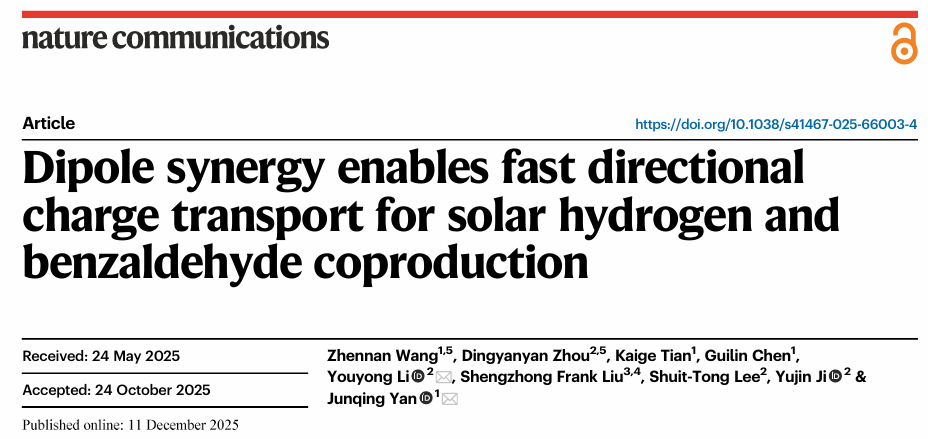 近日,我校材料科学与工程学院闫俊青教授的科研团队联合苏州大学李有勇教授团队,在太阳能光催化制氢与苯甲醛协同制备方面取得重要进展。相关研究成果以“Dipole synergy enables fast directional charge transport for solar hydrogen and benzaldehyde coproduction”为题,于2025年12月11日在国际权威期刊《Nature Communications》上在线发表。论文第一作者为我院博士研究生王振南,通讯作者为我院闫俊青教授和苏州大学李有勇教授。