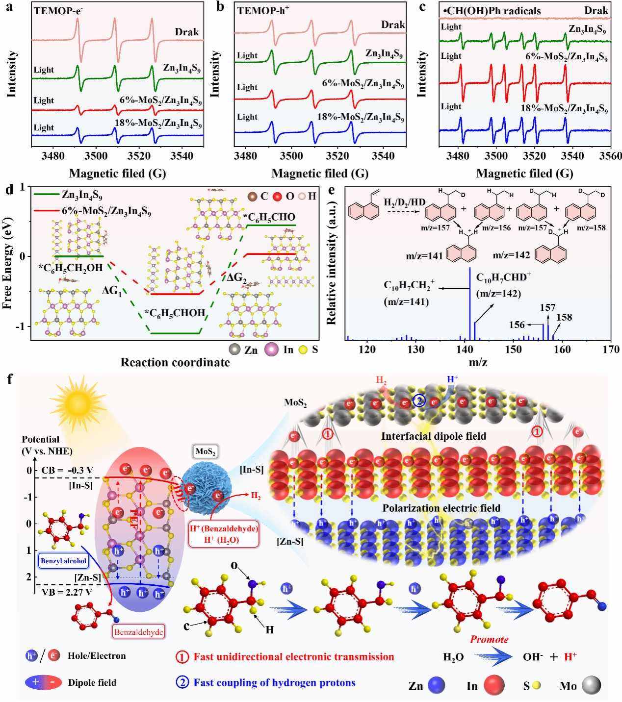 研究核心在于设计并构筑了一种新型复合光催化材料:6%-MoS2/Zn3In4S9。该材料通过溶剂热法构建了独特的“球对球”异质结构。研究发现,非对称结构的Zn3In4S9其本征偶极矩在体相内产生了一个强大的极化电场,有效抑制了光生电子-空穴在体相内的复合。同时,在界面处引入的MoS2诱导产生了界面偶极场,与体相极化电场协同作用,构建了一条从Zn3In4S9到MoS2的快速、定向电子传输“高速公路”。得益于这种“偶极协同”机制,优化后的6%-6%-MoS2/Zn3In4S9复合材料表现出卓越的光催化性能:产氢速率达41.19 mmol g⁻¹ h⁻¹,苯甲醛生成速率达43.33 mmol g⁻¹ h⁻¹,分别是纯Zn3In4S9的11.8倍和12.2倍。在420 nm单色光照射下,产氢与产苯甲醛的表观量子效率分别高达36.6% ± 0.7% 和 40.0% ± 0.3%。该材料还展现出优异的稳定性,在30小时的连续测试中仍能保持93.8%的产氢活性和87%的苯甲醛生成活性。该研究综合利用了压电力显微镜、开尔文探针力显微镜、飞秒瞬态吸收光谱、原位XPS、原位EPR以及理论计算等多种先进表征手段,从原子尺度到宏观性能,全方位揭示了偶极场协同驱动电荷快速分离与传输的微观机制,为理性设计高效人工光合系统提供了全新的思路和坚实的理论依据。研究工作获得了国家自然科学基金、陕西省自然科学基金、中央高校基本科研业务费等多个项目的支持。