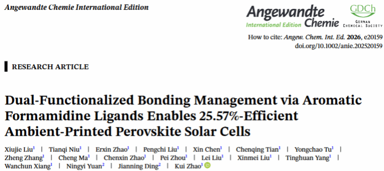 本工作为大气环境印刷制备钙钛矿光伏器件提供了一种行之有效的材料设计与结晶动力学调控方法。通过双重化学键合策略,同步解决了环境兼容性、结晶控制与薄膜放大制备难题,为推进钙钛矿光伏技术的低成本、产业化发展提供了新思路。相关研究工作以“Dual-Functionalized Bonding Management via Aromatic Formamidine Ligands Enables 25.57%-Efficient Ambient-Printed Perovskite Solar Cells”为题,发表于国际顶级期刊《Angewandte Chemie International Edition》。我院2023级硕士研究生刘秀洁为论文第一作者,牛天启博士和赵奎教授为共同通讯作者(论文链接:https://onlinelibrary.wiley.com/doi/10.1002/anie.202520159)。