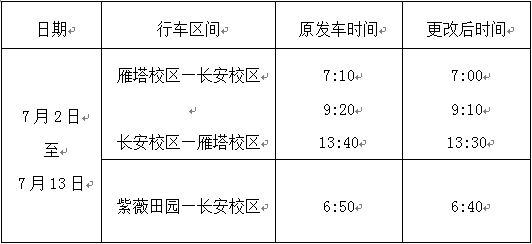 根据学校教务处期末考试的通知,2018年7月2日至7月13日进行学年度第二学期期末考试。为切实做好考试期间乘车保障,现将通勤班车运行时间调整如下,请广大教职员工相互转告,按时乘车。