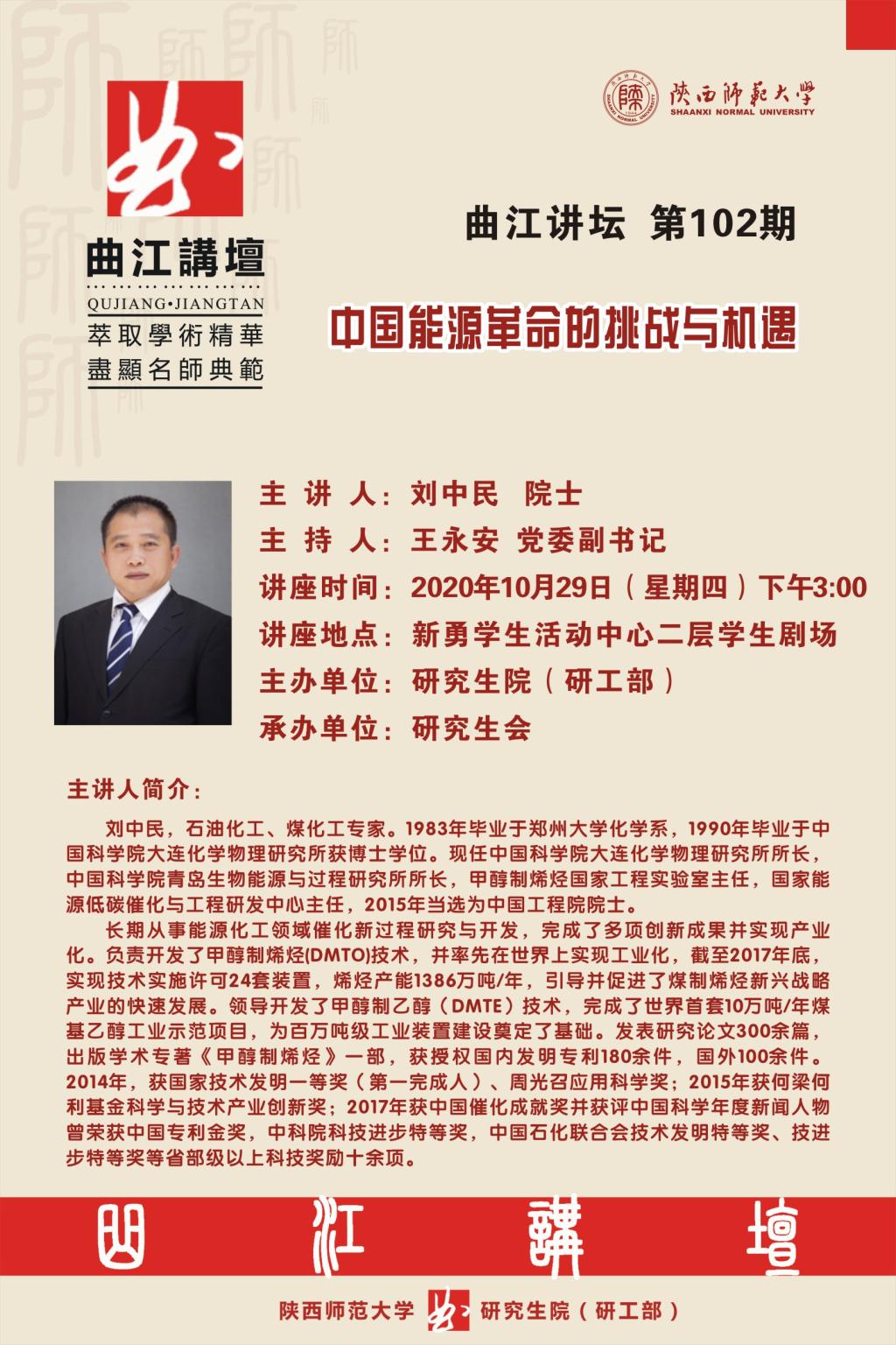 刘中民院士将于10月29日做客我校“曲江讲坛”,主讲题为《中国能源革命的挑战与机遇》的报告,为了提升我院研究生的学术水平,拓宽研究视野,学院要求组织我院研究生到场学习,2019级硕士研究生全部参加,其他年级研究生同学自愿参加。