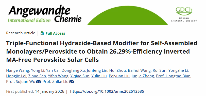 该工作得到了陕西省杰出青年科学基金(2025-JCJQN-004)、广东省光学信息材料与技术重点实验室、广州市科技计划项目(202201000008)、陕西师范大学中央高校基本科研业务费(GK202302005),以及陕西师范大学材料科学与工程学院青年科学家启动项目(2024YSIP-MSE-SNNU002,2023YSIP-MSE-SNNU012)等项目支持。相关成果以“Triple-Functional Hydrazide-Based Modifier for Self-Assembled Monolayers/Perovskite to Obtain 26.29%-Efficiency Inverted MA-Free Perovskite Solar Cells”为题发表于国际著名期刊Angewandte Chemie International Edition上。我院2023级硕士研究生王涵叶为第一作者,通讯作者为我院刘治科教授和华南师范大学吴素娟副教授。